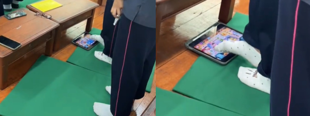 แยกจากเกมไม่ได้ โดนครูทำโทษให้ยืนเรียน ก็ยังใช้เท้าเล่นเกมได้ชิล ๆ