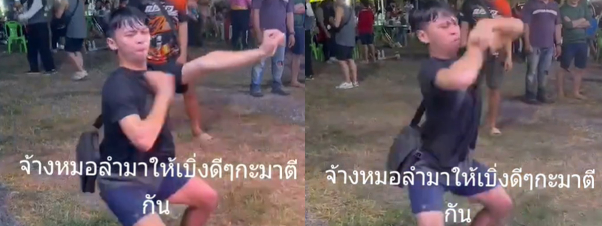 ผู้ใช้ TikTok @jimjumladya2 ได้เผยภาพเวทีหมอลำในงานวัดแห่งหนึ่ง มีชายหนุ่มเต้นหน้าเวที ประชันลีลาสุดมันส์กับแดนเซอร์แบบไม่มีใครยอมใคร ไม่รู้ว่าท่าเต้นไปล่อเท้าใครหรือเปล่า อยู่ ๆ ก็มีคนพุ่งตัวจากข้างหลังเตะก้านคอเข้าเต็ม ๆ ล่าสุดคนที่อยู่ในเหตุการณ์บอกว่าโดนตำรวจจับแล้วเรียบร้อย กลายเป็นภาพที่มีกระแสวิพากษ์วิจารณ์อย่างหนัก ชาวเน็ตต่างพูดว่า เขาเต้นในพื้นที่ของเขา มีสิทธิ์อะไรไปเตะเขา