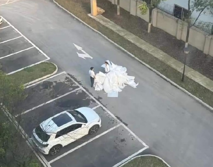 ภาพถ่ายดังกล่าวถูกถ่ายขึ้นจากมุมสูงของบนอาคารแห่งหนึ่ง ซึ่งเมื่อมองลงไปที่ด้านล่างบริเวณลานจอดรถ จะเห็นว่ามีชายและหญิง 2 คนยืนอยู่ตรงนั้น โดยทั้งสองสวมชุดสีขาว ลักษณะคล้ายกับกำลังจะเตรียมตัวไปเข้าพิธีวิวาห์ หรือกำลังถ่ายภาพงานแต่งงาน