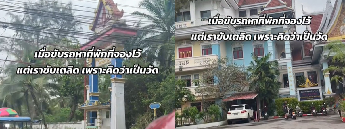 ผู้ใช้ TikTok @benyatip_me ได้เผยภาพสาวคนหนึ่ง กำลังขับรถหาที่พักที่จองไว้ ขับไปตามทางที่บอก แต่เกือบขับเลย เพราะภายนอกเหมือนวัดมาก ๆ ต้องเข้าไปดูข้างใน ถึงจะรู้ว่าคือโรงแรมจริง ๆ เชื่อว่าต้องมีคนเข้าใจว่าเป็นวัดแน่ ๆ ตกแต่งเหมือนแทบทุกอย่าง