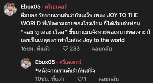 ส่วนหลังจากที่มีเรื่องกันแล้ว ก็มีเพลงหนึ่งนั้นขึ้น เป็นเหตุผลว่าทำไมคนเรียกเหตุการณ์นี้ว่า Joy to the world พอผ่านมาแล้ว ในมุมของตนก็เข้าใจที่หลายคนจะมองในมุมที่ตลก และอยากให้ทุกคนเข้าใจเรื่องราวตรงกันไม่คลาดเคลื่อน