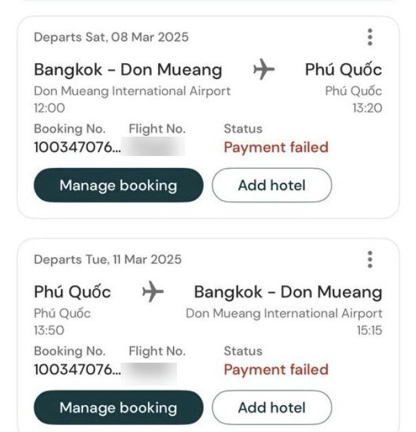 ขณะที่ เพจเฟซบุ๊ก Drama-addict โพสต์ระบุว่า ลูกเพจแจ้งมาว่า เจอปัญหา ซื้อ ตั๋วเครื่องบิน ผ่านแอปฯ ของสายการบินหนึ่ง ตัดเงินผ่านบัญชี ปรากฏว่า เงินถูกตัดจากบัญชีแล้ว แต่จองตั๋วล้มเหลว (Booking Failed) ผู้เสียหายรายหนึ่งเสียเงินไปกว่า 4 หมื่นบาท สายการบินไม่มีคอลเซ็นเตอร์ให้โทร. ติดต่อ มีแต่ให้คุยกับ Bot เป็นระบบโต้ตอบอัตโนมัติ ซึ่งแก้ปัญหาไม่ได้ ซึ่งพบว่าเคสนี้มีผู้เสียหายเป็นจำนวนมาก เคสนี้สายการบินแจ้งกลับมาว่า จะคืนเงินภายใน 14 วันทำการ แต่เกิน 14 วันแล้วลูกค้ายังไม่ได้เงินคืน