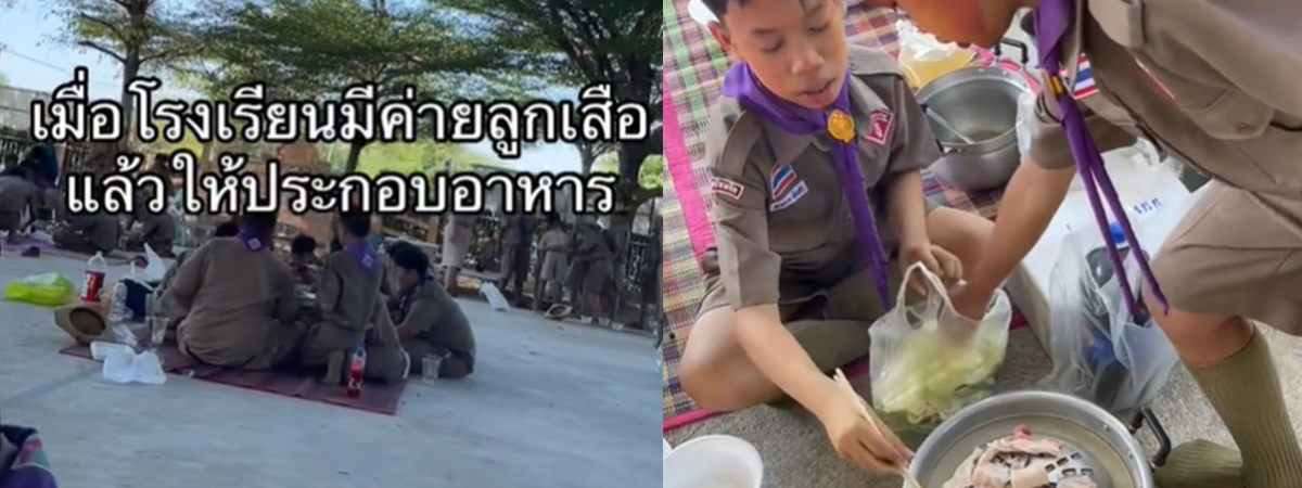 ผู้ใช้ TikTok @kimnapatch ได้เผยภาพนักเรียนทำกิจกรรมเข้าค่ายลูกเสือ โดยครูให้นักเรียนร่วมกันทำอาหารกินเองเป็นหมู่ สามารถทำเมนูอะไรก็ได้ตามต้องการ พร้อมมีวัตถุดิบเตรียมให้ สิ่งที่ครูเห็นนั้น นักเรียนทุกหมู่พากันนั่งกินหมูกระทะ ทำบรรยากาศในค่ายเป็นร้านหมูกระทะไปแล้ว ชาวเน็ตพากันขำและเอ็นดูทั้งโซเชียล