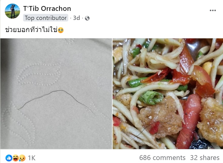 วันที่ 12 มกราคม 2568 เฟซบุ๊ก T'Tib Orrachon มีการลงภาพการสั่งส้มตำร้านหนึ่ง สีสันน่ากินมาก ทว่าพบสิ่งปริศนาที่อยู่ในส้มตำ สงสัยว่ามันเป็นอะไรจึงโพสต์ถามในกลุ่ม พวกเราคือผู้บริโภค พร้อมข้อความว่า "ช่วยบอกทีว่าไม่ใช่"