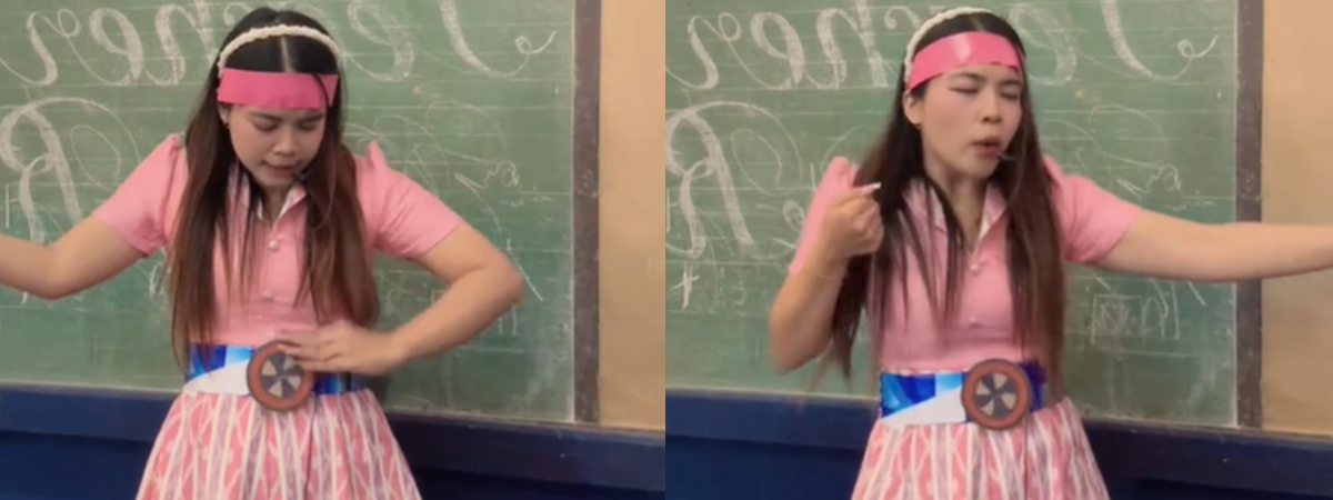 ผู้ใช้ TikTok @kru_puifai ได้เผยภาพครูสาวท่านหนึ่ง ใส่ชุดไหมไทยตามที่ ผอ.โรงเรียน บอก นอกจากชุดที่ใส่มาแล้วยังจัดเต็มทั้งเพลงและสเต็ปแดนซ์อีกด้วย สร้างสีสันในวันครูจนชาวเน็ตพากันขำกระจาย แถมยังแซวด้วยว่า นี่สินะชุดไหมไทยของจริง
