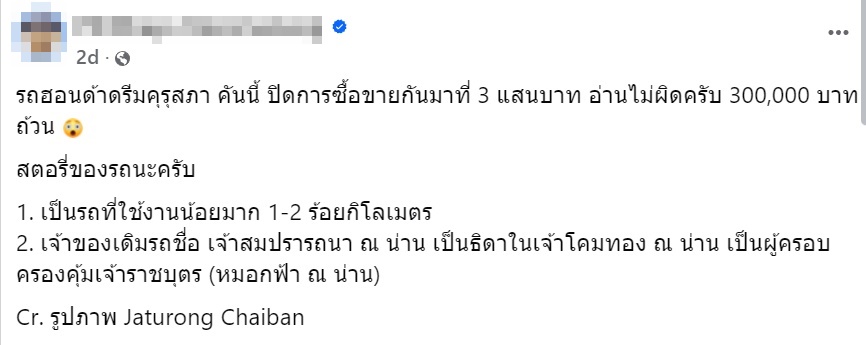 ด้านผู้ใช้เฟซบุ๊กรายหนึ่ง จึงได้โพสต์เล่าถึงสาเหตุที่รถขายได้ราคาแพงว่า รถฮอนด้าดรีมคุรุสภา สามารถซื้อขายได้ถึง 3 แสนบาทจริง เนื่องจากรถคันดังกล่าวมีสตอรี่ดังนี้