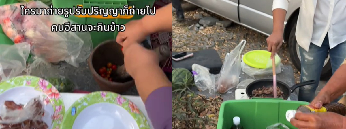 ผู้ใช้ TikTok @frangkulrr ได้เผยภาพครอบครัวไปงานรับปริญญา รอบัณฑิตรับเสร็จก็ใช้เวลานาน เลยหาอะไรทำแก้เบื่อระหว่างรอ ขนอุปกรณ์มาแบบจัดเต็ม ตำส้มตำและทำเมนูอื่นกินทั้งครอบครัว ราวกับไปปิกนิกชิล ๆ เลยทีเดียว จนใครเห็นอดนึกถึงตอนครอบครัวตัวเองไปงานรับปริญญาไม่ได้เลยจริง ๆ
