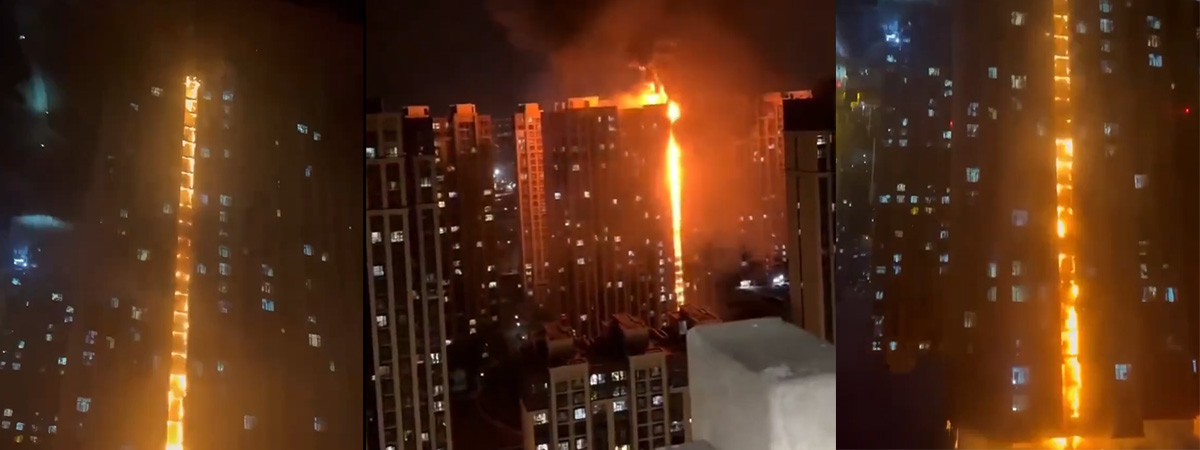 ภาพที่ปรากฏบนโลกออนไลน์เผยให้เห็นตึกสูงระฟ้าที่มีเหตุเพลิงไหม้รุนแรง แสงไฟสีส้มตัดกับท้องฟ้ายามกลางคืน ส่องสว่างตั้งแต่ชั้นล่างไปจนถึงชั้นบนสุดของอาคาร เปลวเพลิงยังโหมรุนแรงและลุกไหม้อย่างไม่มีท่าทีจะดับลงง่าย ๆ และยังทำให้เกิดกลุ่มควันหนาปกคลุมทั่วบริเวณ