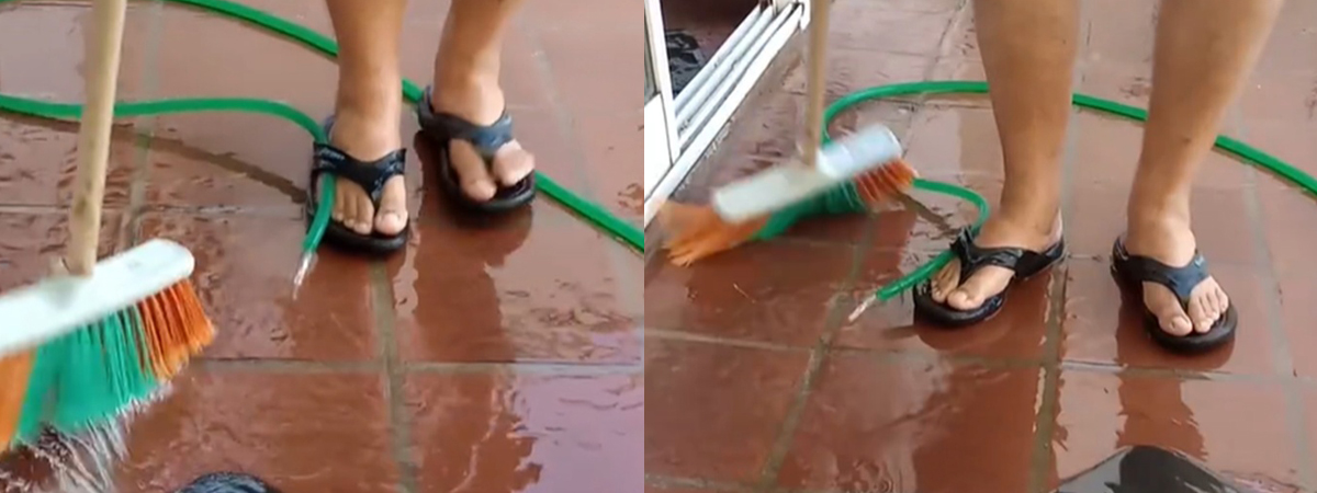 ผู้ใช้ TikTok @yohanaamaya6 ได้เผยภาพสาธิตการทำความสะอาดพื้นแบบใหม่ ปกติจะนำสายยางเปิดน้ำแล้ววางไว้บนพื้น แล้วขัดให้สะอาด แต่กลัวว่าน้ำจะไปไม่ทั่วถึงเลยเอาสายยางหนีบใส่รองเท้า ขัดพื้นได้อย่างเต็มที่ เป็นไอเดียที่จีเนียสจนชาวเน็ตแทบคาดไม่ถึงว่าทำแบบนี้ได้
