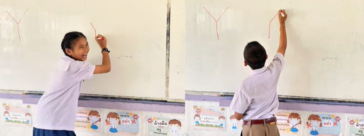 ครูท้านักเรียนในชั้น เขียนตัวอักษร Y แบบห้ามทับเส้นและยกมือ คนสุดท้ายพีคสุด