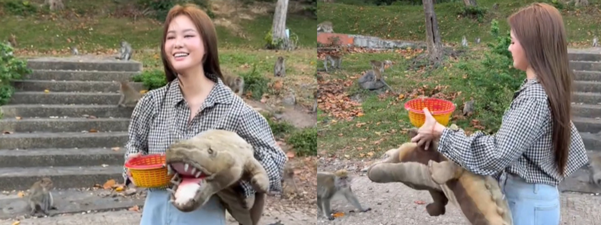 ผู้ใช้ TikTok @ppinnapaaa ได้เผยภาพสาวสวยคนหนึ่ง อยากเดินไปให้อาหารลิงด้วยตัวเอง แต่เกิดอาการกลัวลิงจะเข้ามาทำร้ายจนบาดเจ็บ เธอผุดไอเดียในการให้อาหารแบบใหม่ ถือตุ๊กตาจระเข้ไปด้วยซะเลย ฝั่งคนก็กลัวลิง ส่วนลิงก็กลัวตุ๊กตาจระเข้ จะเข้าไปเอาของกินก็ไม่กล้า งานนี้ลิงจะได้กินไหมนะ...