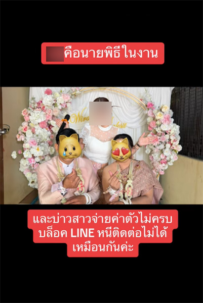 ขณะที่วานนี้ (28 กุมภาพันธ์) ผู้ใช้ TikTok อีกราย ซึ่งทำหน้าที่เป็นนายพิธีให้แก่คู่บ่าวสาวในพิธีแต่งงานดังกล่าว ก็ได้ออกมาเผยว่า เช่นเดียวกับช่างภาพที่โดนบ่าวสาวเบี้ยวค่าจ้าง บ่าวสาวคู่นี้ก็เบี้ยวค่าจ้างเธอเช่นกัน จ่ายค่าตัวให้ไม่ครบ และบล็อกไลน์หนี ติดต่อไม่ได้เช่นกัน