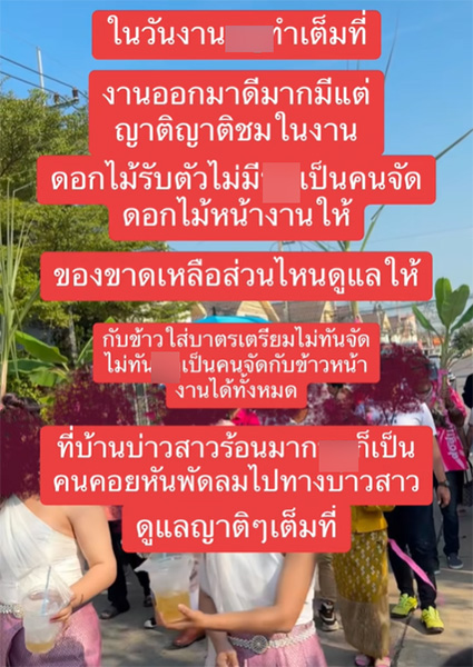 ทั้งนี้ เธอยืนยันว่าในวันงานได้ทำหน้าที่เต็มที่ งานออกมาดีมาก มีแต่ญาต ๆ ชมกัน ดอกไม้รับตัวไม่มี เธอก็เป็นคนจัดดอกไม้หน้างานให้ ของขาดเหลือส่วนไหนช่วยดูแล กับข้าวใส่บาตรเตรียมไม่ทัน จัดไม่ทัน เธอก็เป็นคนจัดกับข้าวหน้างานทั้งหมด ที่บ้านบ่าวสาวร้อนมากเธอก็เป็นคนคอยหันพัดลมไปทางบ่าวสาว ดูแลญาติ ๆ เต็มที่ ไม่ได้นั่งเลยในงาน