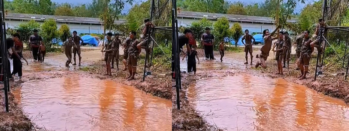 ฝึกจาก นาตาชา โรมานอฟฟ์ มารึเปล่านะ นักเรียนลูกเสือ โหนเชือกข้ามโคลน แต่ท่าลงอย่างกับซูเปอร์ฮีโร่