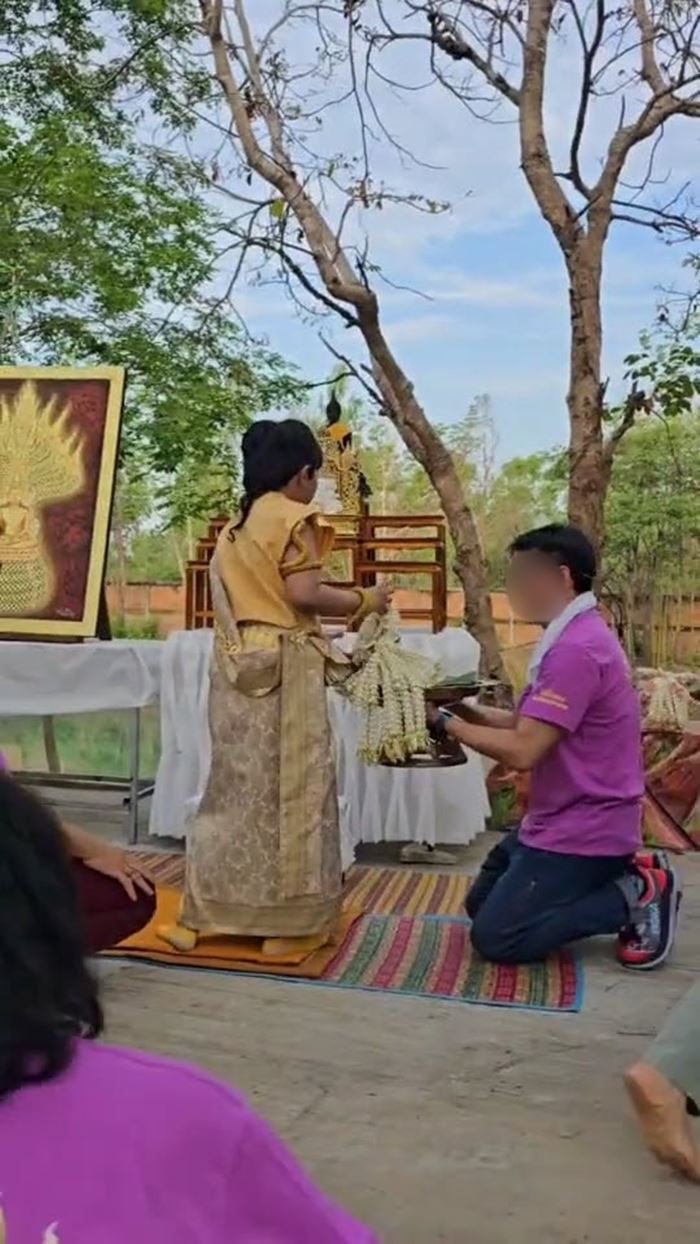 ส่วนภาพดังกล่าวพบว่า เป็นช่วงหนึ่งของพิธีที่ให้ผู้ร่วมงานนั่งเป็น 2 แถวระหว่างทางเดิน ซึ่งมีเด็กชายเดินนำ ตามด้วยพ่อและแม่ โดยระหว่างทางก็จะมีผู้คนต่างก้มกราบเด็กชาย ก่อนที่ปลายทางนั้นเด็กชายจะหยิบพวงมาลัยถวายและก้มกราบบูชาพระพุทธรูป