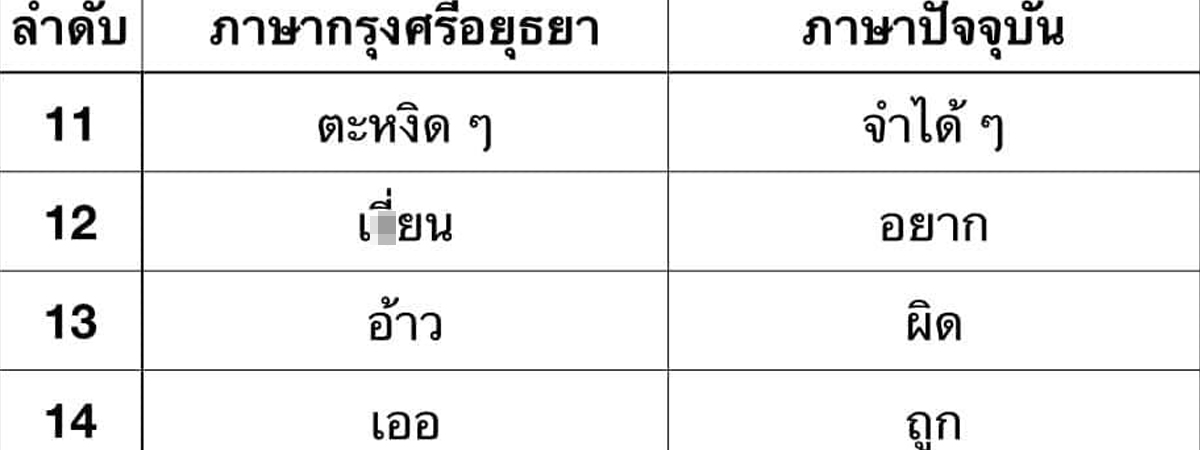 เฟซบุ๊กเพจ รักษ์ภาษาไทย ได้พาชมวิวัฒนาการของภาษาไทย โดยเริ่มจากคำที่ใช้ในสมัยกรุงศรีอยุธยา เทียบกับภาษาปัจจุบัน ถึงแม้ว่าคำจะเปลี่ยน แต่ความหมายใกล้เคียงและเหมือนเดิม พอมาดูคำในยุคกรุงศรีฯ บอกได้เลยว่า เหนือความคาดหมายทั้งนั้น แถมชาวเน็ตยังโฟกัสอยู่แค่คำนั้นคำเดียวอีกด้วย