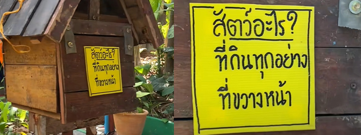 ผู้ใช้ TikTok @kanthisa_cherry ได้เผยภาพสาวคนหนึ่ง ไปเที่ยวที่นครนายก เห็นป้ายฟิวเจอร์บอร์ดเขียนแปะหน้าบ้านไม้เล็ก ๆ โดยเขียนในเชิงคำถามที่ว่า สัตว์อะไรกินได้ทุกอย่างที่ขวางหน้า ทำเอาอยากรู้เลยว่าเป็นสัตว์ตัวอะไรที่อยู่ข้างใน หลังจากที่เปิดดู ถึงกับตกใจหนักมาก ปิดบ้านเกือบไม่ทัน