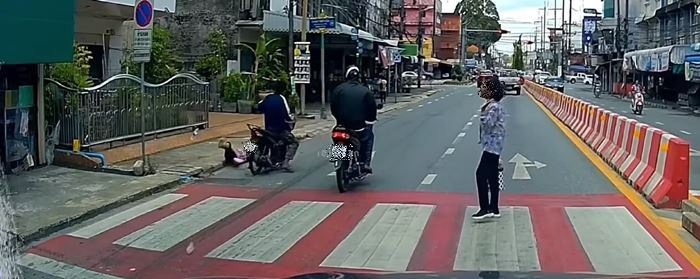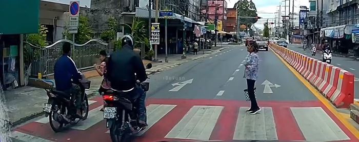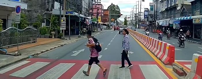 จากคลิปเผยให้เห็นว่าจุดดังกล่าวนั้นเป็นพื้นที่ในชุมชน และมีทางม้าลายทาสีขาว-แดงไว้อย่างชัดเจน มีเด็กนักเรียนกับผู้หญิงเดินข้ามมาจากฝั่งขวา รถคันอื่น ๆ ต่างจอดหยุดให้ข้าม ซึ่งเด็กก็ยกมือไหว้ขอบคุณ แต่เมื่อไปถึงเลนซ้ายสุดกลับมีรถจักรยานยนต์คันหนึ่งไม่ได้หยุด ก่อนจะพุ่งมาชนจนเด็กล้มลงบาดเจ็บ