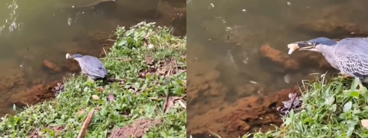 เฟซบุ๊ก รุธ นิรุธ คงภิรมย์ ได้เผยภาพนกตัวหนึ่ง เดินมาพร้อมกับคาบอาหารตรงบริเวณริมน้ำ จนเกิดอาการเอะใจว่ามันทำอะไร ก่อนที่เห็นนกยื่นอาหารเหนือน้ำ รู้ทันทีเลยว่า นกกำลังเอาเหยื่อล่อปลา แต่กว่าจะได้ปลามาเป็นอาหาร เกือบเสร็จเต่าไปหลายรอบอยู่พอสมควร ทางด้านชาวเน็ตชื่นชมในความฉลาดของน้อง ที่จับปลาได้สำเร็จ