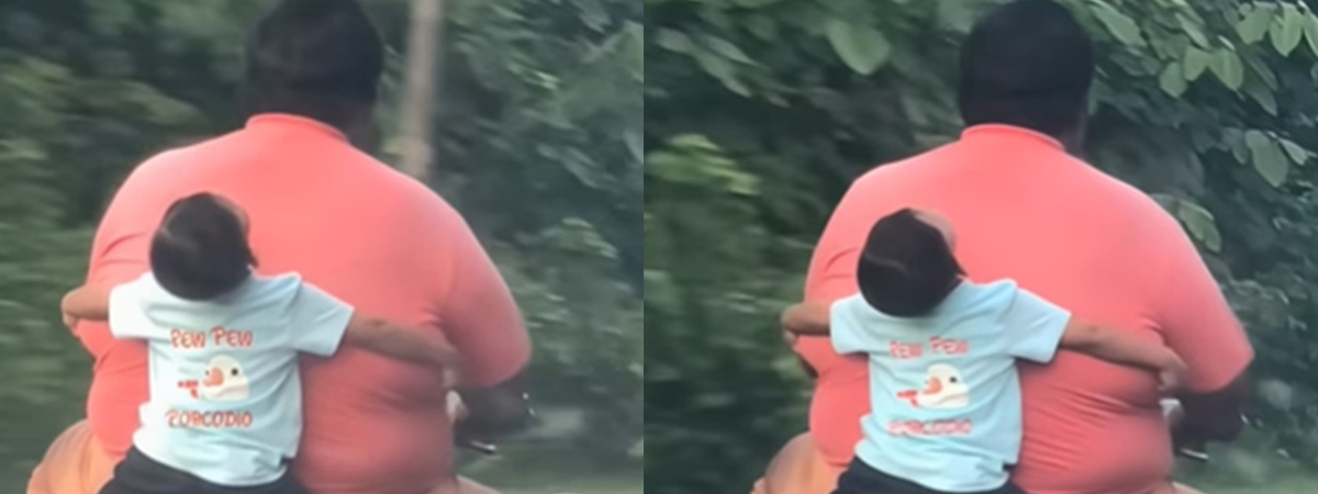 พากันเอ็นดูทั้งโซเชียล เด็กเกาะหลังพ่อ ซ้อนท้ายมอเตอร์ไซค์ ยื่นแขนโอบแบบสู้ชีวิต