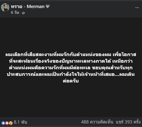 ก่อนหน้านั้นไม่กี่วัน ทราย สก๊อต โพสต์ข้อความว่า "ผมเลือกที่เสียสละงานที่ผมรักกับตำแหน่งของผม เพื่อโอกาสที่จะสะท้อนเรื่องจริงของปัญหาทะเลทางภาคใต้ เหนือกว่าตำแหน่ง ผมคือความรักที่ผมมีต่อทะเล ขอบคุณ สำหรับทุกประสบการณ์ และผมเป็นกำลังใจให้เจ้าหน้าที่เสมอ…ผมเดินต่อครับ"