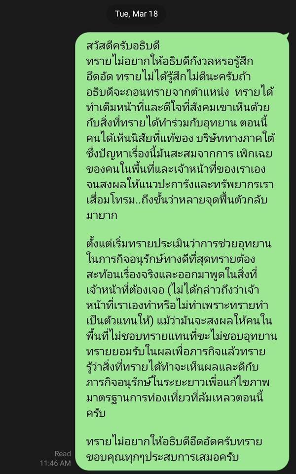 ตั้งแต่เริ่มทรายประเมินว่าการช่วยอุทยาน ในภารกิจอนุรักษ์ ทางดีที่สุดทรายต้องสะท้อนเรื่องจริงและออกมาพูดในสิ่งที่เจ้าหน้าที่ต้องเจอ (ไม่ได้กล่าวถึงว่าเจ้าหน้าที่เราเองทำหรือไม่ทำ เพราะทรายทำเป็นตัวแทนให้) แม้ว่ามันจะส่งผลให้คนในพื้นที่ไม่ชอบทราย แทนที่จะไม่ชอบอุทยาน ทรายยอมรับในผล เพื่อภารกิจแล้วทรายรู้ว่าสิ่งที่ทรายได้ทำจะเห็นผลและดีกับภารกิจอนุรักษ์ในระยะยาว เพื่อแก้ไขภาพมาตรฐานการท่องเที่ยวที่ล้มเหลว ตอนนี้ทรายไม่อยากให้อธิบดีอึดอัดครับ ขอบคุณทุก ๆ ประสบการณ์เสมอครับ"