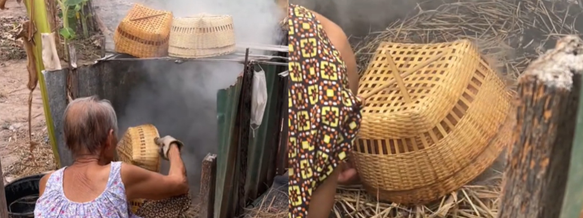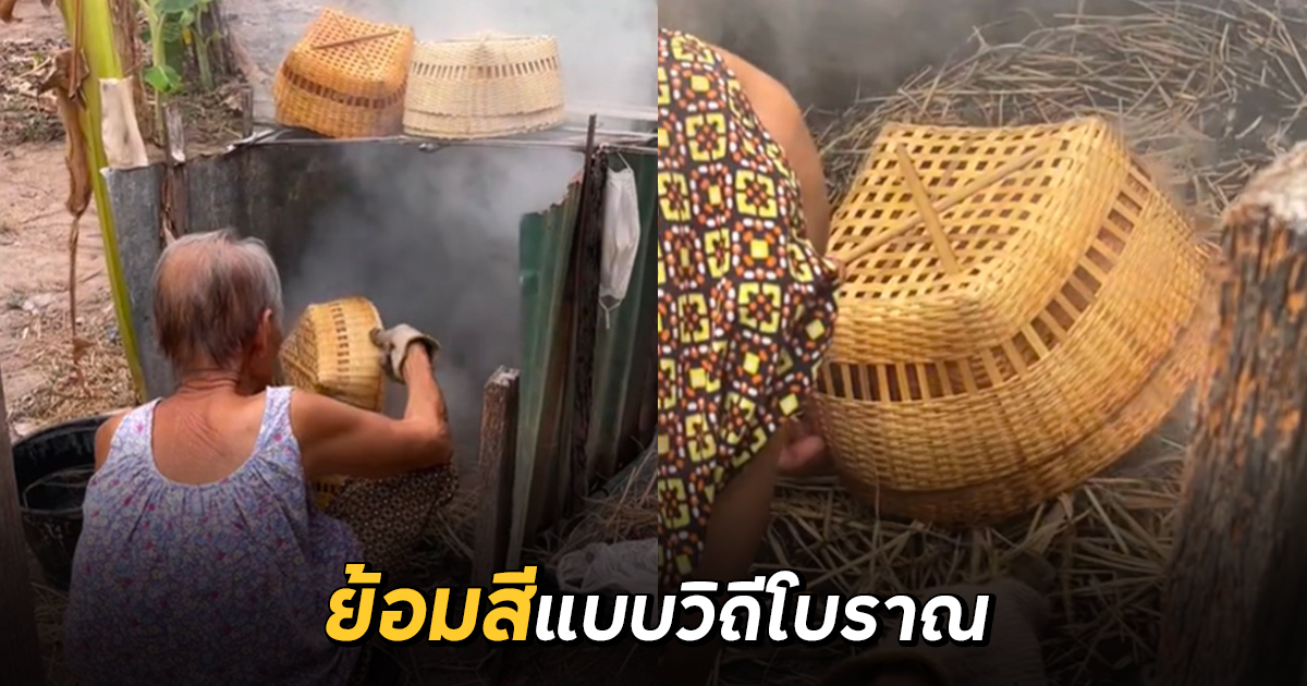 ผู้ใช้ TikTok @bamboo_house4949 ได้เผยภาพคุณยายท่านหนึ่ง สาธิตการย้อมสีกระจาด ซึ่งเป็นวิธีแบบดั้งเดิมที่คนยุคโบราณใช้กัน โดยใช้วิธีเอาฟางมารมควันในการย้อมสี เพื่อให้สีกระจาดเป็นสีน้ำตาลแบบธรรมชาติ ต้องมีทั้งความประณีต ใจเย็น และมีฝีมือของจริง แถมยังออกมางดงามอีกด้วย