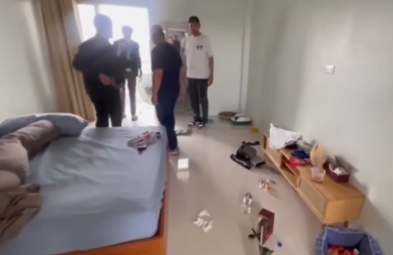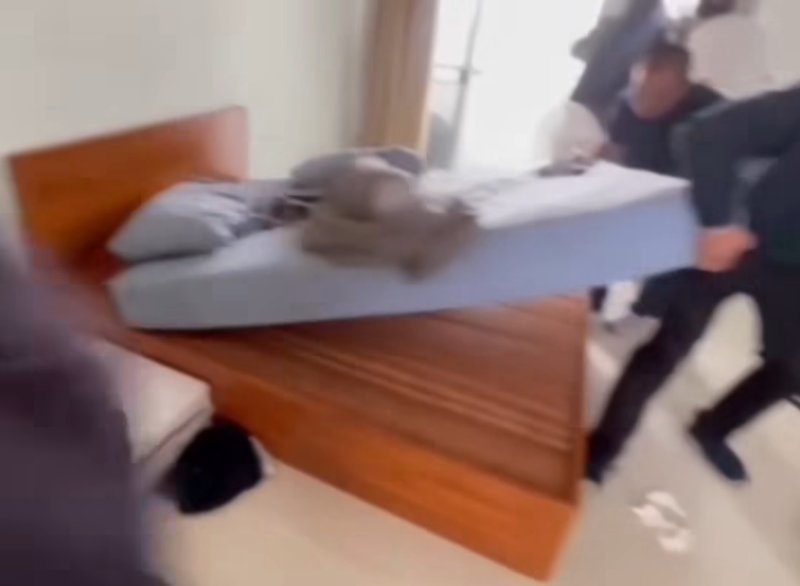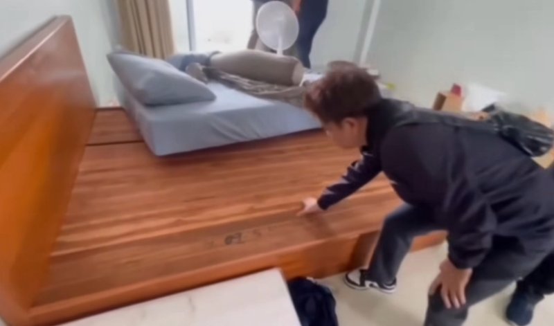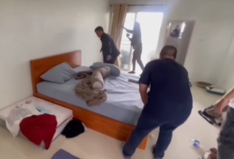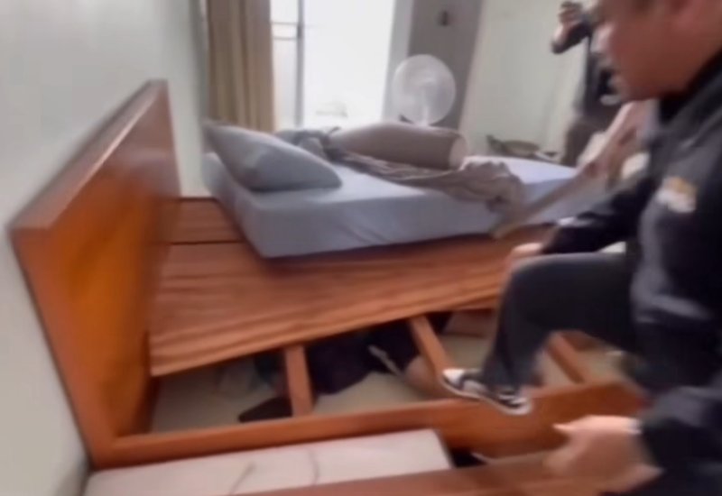 เจ้าหน้าที่ค้นห้องไปเรื่อยทุกจุด ทั้งห้องน้ำ ตู้เสื้อผ้า แต่ก็ไม่เจอใคร กระทั่งมาดูที่เตียง พบว่าเป็นเตียงเปล่า มีฟูก จึงได้ยกฟูกออก เห็นไม้กระดานรองอยู่ใต้ฟูกอีกชั้นหนึ่ง