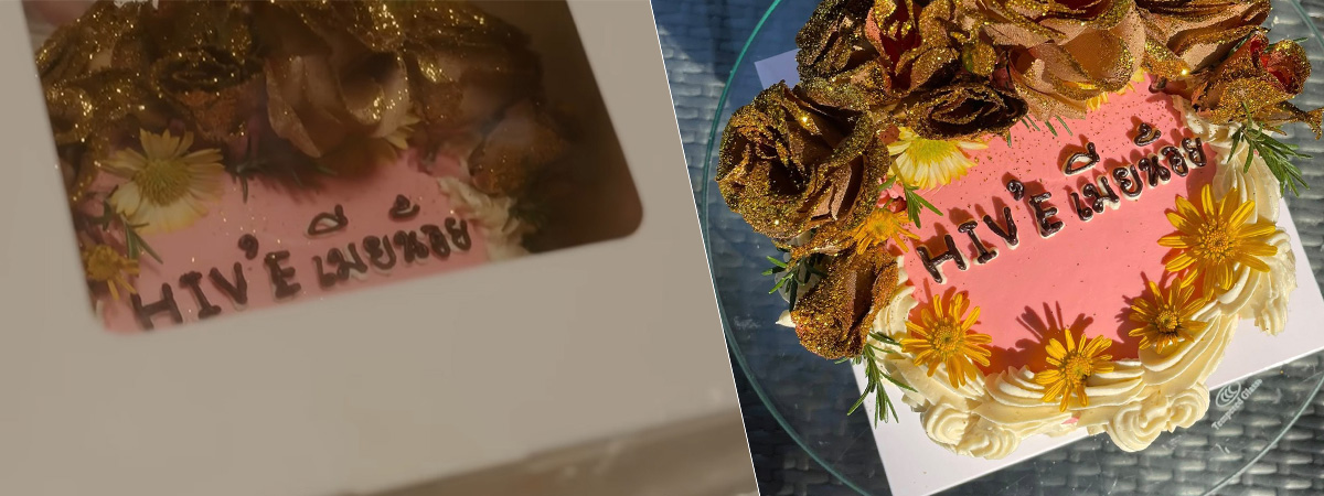 โดยเค้กก้อนดังกล่าว มีการตกแต่งอย่างสวยงามฟรุ้งฟริ้งด้วยดอกไม้สีทอง พร้อมข้อความบนหน้าเค้กว่า "HIV 'E เมียน้อย"