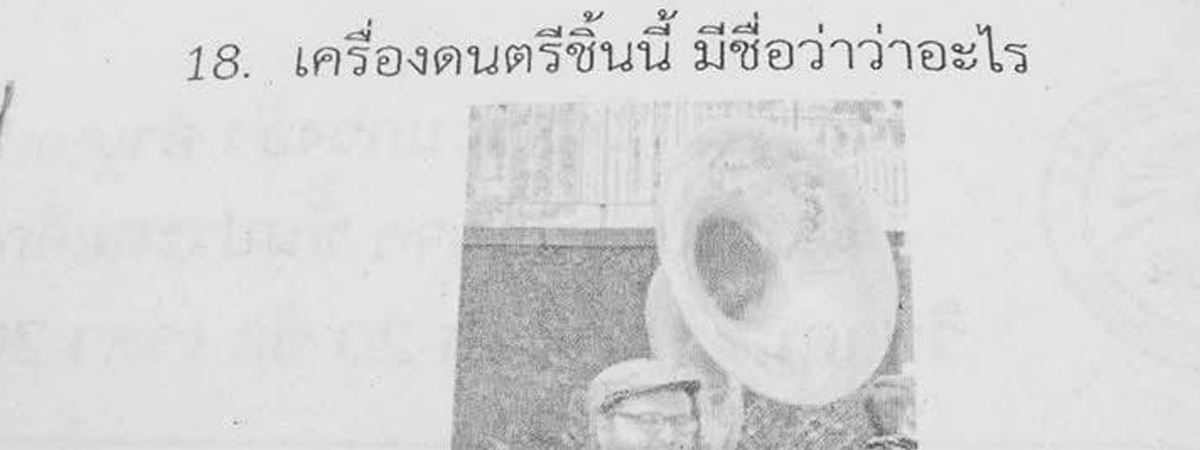 เฟซบุ๊กเพจ โถชีวิตนักดนตรี ได้เผยภาพข้อสอบนักเรียนวิชาดนตรีสากล กับโจทย์ข้อที่ 18 ให้รูปพร้อมกับตั้งคำถาม เครื่องดนตรีชิ้นนี้ มีชื่อว่าอะไร ซึ่งคำตอบก็คือ ทูบา แต่พอมาเห็นตัวเลือกแต่ละข้อ แทบกลั้นขำไม่ไหว ยิ่งมาเห็นตอนกากบาทเลือกคำตอบที่ถูกต้อง ทวีความฮาเข้าไปอีก