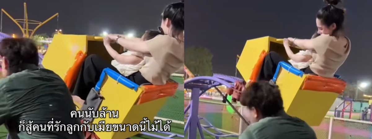 รักจริงยอมทำขนาดนี้ พ่อพาแม่และลูกเล่นรถไฟเหาะ กว่าจะขึ้นได้แต่ละครั้ง เล่นเอาหลังชุ่มเลย