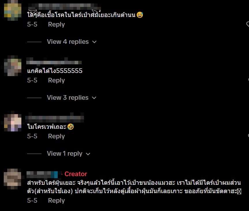 พร้อมกันนั้น เธอยังอธิบายอีกว่า จริง ๆ นี่คือไดร์เป่าขนน้องแมว เนื่องจากไม่มีไดร์เป่าผมส่วนตัวสำหรับใช้เอง