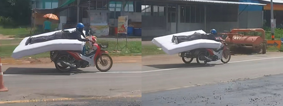 ผู้ใช้ TikTok @usernsm9x412dj ได้เผยภาพตอนคนขับรถส่งของ นำที่นอนไปส่งที่บ้านลูกค้า หลังจากที่มีการสั่งกับทางร้าน แต่สิ่งที่ทำให้คนอึ้งนั้น คงจะเป็นวิธีการขับรถส่งของนี่แหละ เอาที่นอนวางเป็นแนวนอนบนเบาะมอเตอร์ไซค์ จากนั้นคนขับก็นอนขับแบบนั้นไปเลย ราวกับว่าตัวเองเหาะกลางอากาศได้ ไม่อยากนึกภาพตอนเบรกเลยจริง ๆ กลายเป็นไวรัลที่เรียกเสียงฮาสนั่นโซเชียล