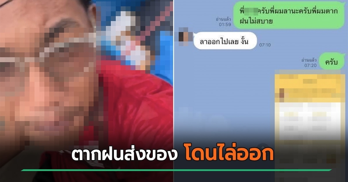 พอดีว่าผมไปสมัครงานที่คลังของขนส่งแห่งหนึ่งย่านไทรม้า (เป็นคนขับส่งพัสดุ) ได้เงินเป็นรายชิ้นจริง ๆ ผมควรได้เงินวันที่ 20 เพราะตัดวีค เป็นจำนวนเงินเกือบ ๆ 4,000 บาทครับ ก่อนที่จะเกิดเรื่องผมขับส่งพัสดุแบบตากฝนจนไม่สบาย ผมจึงทักไลน์ส่วนตัวหัวหน้าไปเพื่อขอลางาน เนื่องจากที่ผมตากฝนส่งพัสดุจึงไม่สบาย ทางหัวหน้า ตอบกลับมาว่า ลาออกไปเลยงั้น"