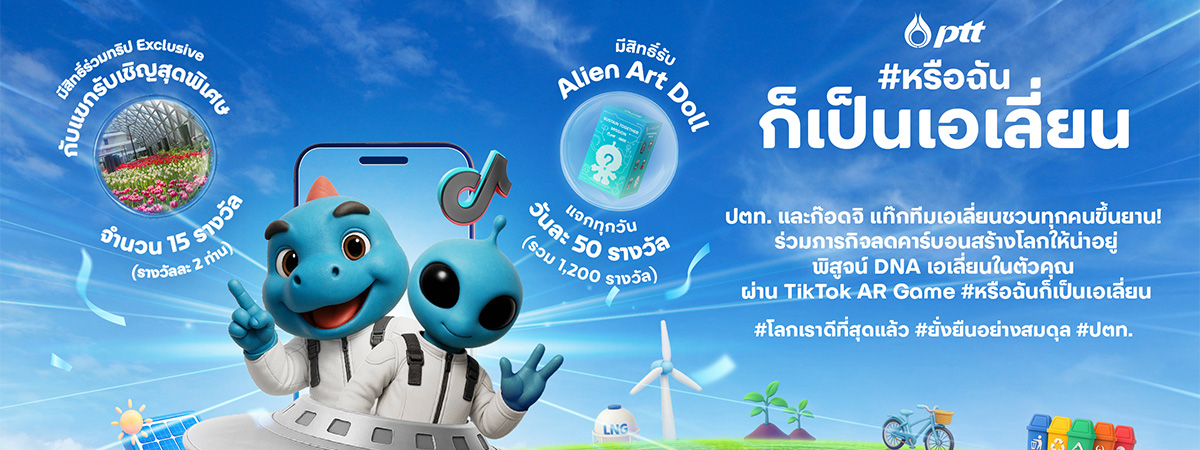 ปตท. และก๊อดจิ แท๊กทีมเอเลี่ยนขอชวนทุกคนขึ้นยาน UFO พลังงานไฟฟ้าไปพร้อม ๆ ร่วมภารกิจลดคาร์บอนสุดมันส์ รวมพลังลดคาร์บอนให้ได้มากที่สุด ผ่าน TikTok AR Game #หรือฉันก็เป็นเอเลี่ยน ที่จะพาทุกคนออกสำรวจไลฟ์สไตล์และนวัตกรรม เก็บไอเทมลดคาร์บอน เพื่อตามหา DNA แห่งความยั่งยืนในตัวคุณ เพราะโลกของเราดีที่สุดแล้ว สิ่งเล็ก ๆ ที่คุณทำ อาจเปลี่ยนโลกได้จริง เพื่อโลกที่ยั่งยืนอย่างสมดุล มุ่งสู่เป้าหมาย Net Zero ลดการปล่อยก๊าซเรือนกระจกสุทธิเป็นศูนย์ ภายในปี 2050