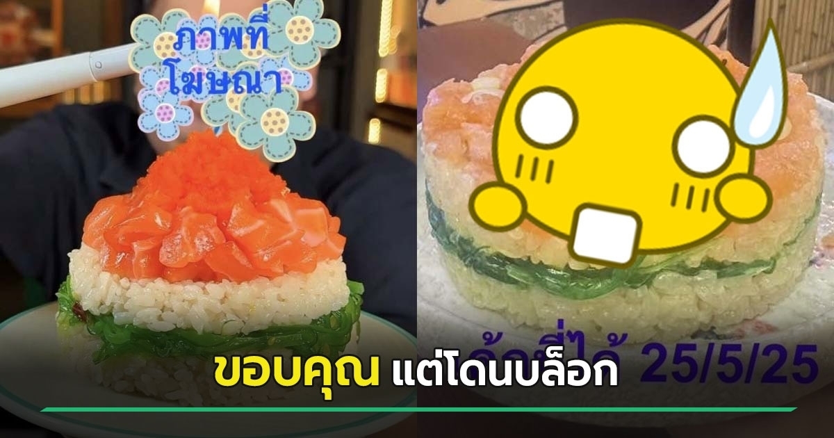 ร้านอาหารญี่ปุ่น จัดโปรโมชั่นวันเกิด ได้เค้กข้าวหน้าปลาแซลมอนฟรี สุดท้ายของจริงเห็นแล้วเงิบ จนต้องไปคอมเมนต์เพจว่า ขอบคุณสำหรับเค้กวันเกิดนะคะ