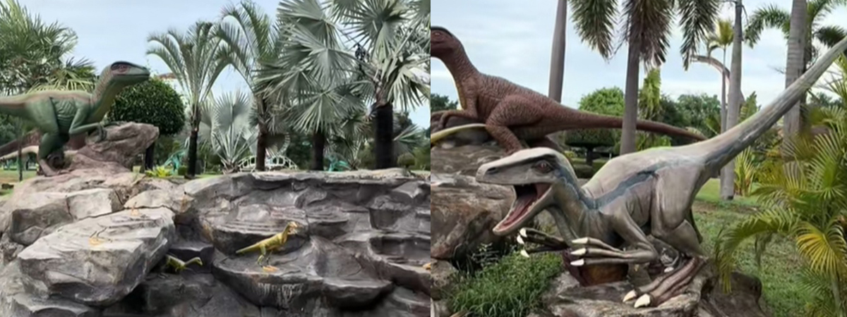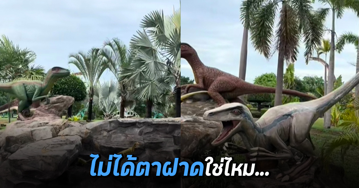 ไม่ได้ตาฝาดใช่ไหม ขับรถผ่านหุ่นปั้นไดโนเสาร์ในสวน แต่เอ๊ะ !! ดูเหมือนมีบางอย่างแปลก ๆ