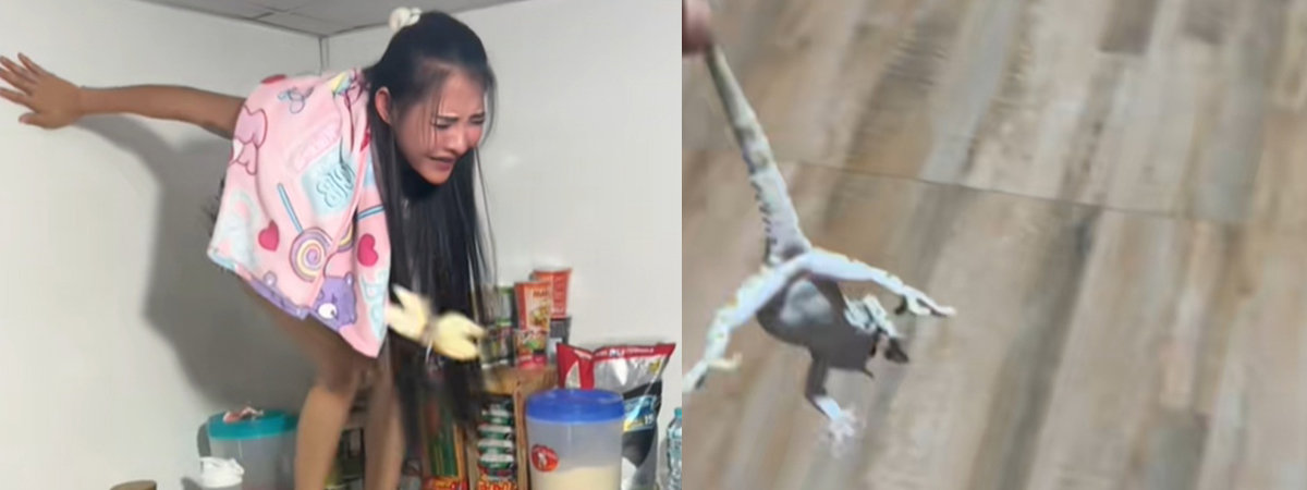 ผู้ใช้ TikTok @nongying650 ได้เผยนาทีตุ๊กแกโผล่ในห้องครัว คนที่กลัวปีนหนีขึ้นโต๊ะไปก่อน ส่วนคนไม่กลัวพยายามจับหางมัน เพื่อปล่อยออกตามธรรมชาติ หลังจากที่จับหางมาได้ ชอตสุดท้ายทำเอากรี๊ดแตกยิ่งกว่า เพราะหางตุ๊กแกดันขาดซะงั้น ตุ๊กแกตกไปอยู่พื้นเหมือนเดิม ไม่รู้จะขำหรือสงสารดี