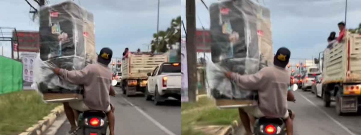 ทึ่งกันทั้งถนน วิถีคนแข็งแกร่ง ซ้อนท้ายมอเตอร์ไซค์ แบกตู้เย็นแบบชิล ๆ