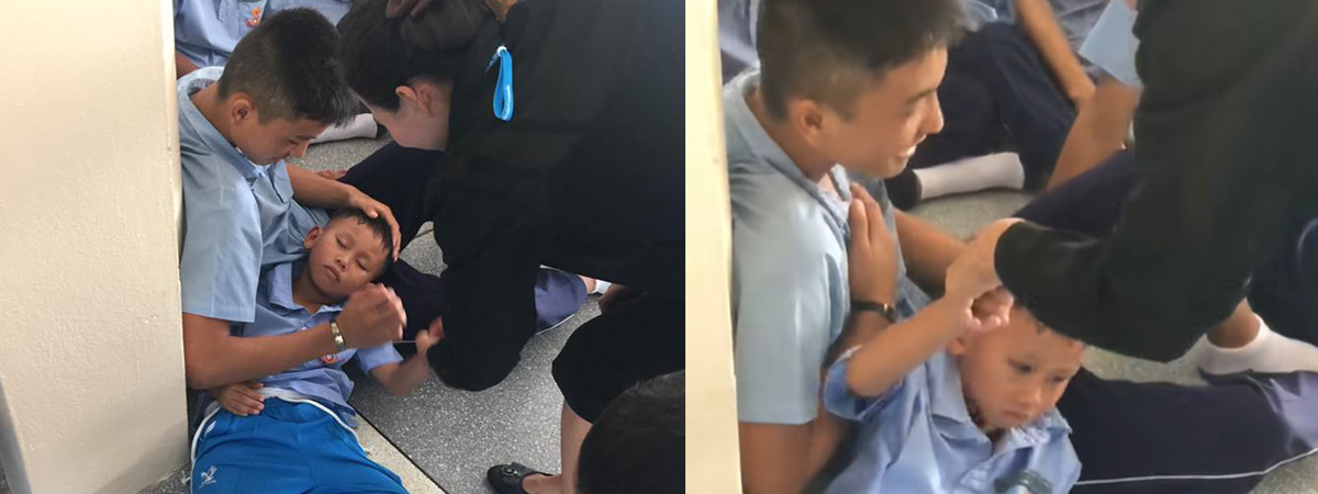 เฟซบุ๊ก Kullathida Kaewphimpha ได้โพสต์ภาพบรรยากาศซ้อมกิจกรรมวันไหว้ครู มีน้องนักเรียนชั้น ป.1 ที่อยู่ในอาการง่วงจัด จนเผลอลงไปนอนตักพี่ ม.3 แถมพี่ยังเอ็นดูให้น้องหลับต่อไป พอครูมาเห็นเข้า ปลุกให้น้องตื่น รู้ตัวอีกทีไปนอนตักพี่เขาตอนไหน มีความยืนงงเล็กน้อย พี่ ๆ พากันขำและเอ็นดูน้องกันทั้งโรงเรียน