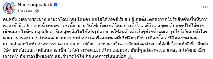 ว่าโดนกันบ้างหรือไม่ งั้นนี้ นุ่น นพลักษณ์ บิวตี้บล็อกเกอร์อีกราย จึงออกมาโพสต์ ชี้ว่าตนเองก็โดนเช่นกัน แต่ปฏิเสธไปตั้งแต่ต้นแล้วว่าหากมีข้อเสนอแบบนี้ ขอไม่รับสินค้าเซตนี้มาทดลอง เพราะตนเองก็ทำงานตรงนี้มานาน ไม่ใช่ครั้งแรกที่โดน พร้อมเล่าถึงเคสที่เคยพบเจอมา ดังนี้