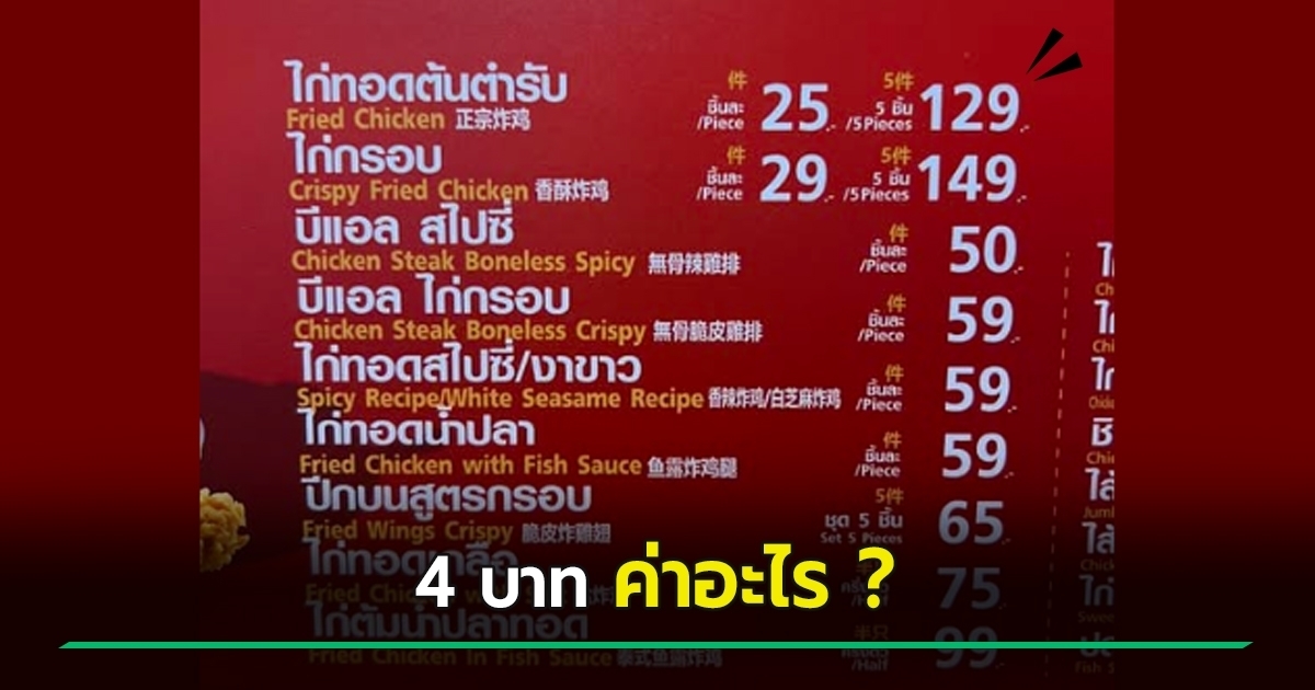 โดยวานนี้ (29 กรกฎาคม 2568) ผู้ใช้เฟซบุ๊กรายหนึ่ง โพสต์ภาพลงกลุ่ม "พวกเราคือผู้บริโภค" โชว์ป้ายราคาเมนูไก่ทอดจากร้านหนึ่ง ซึ่งมีเมนูหลากหลาย แสดงราคาทั้งเป็นชิ้นและเป็นชุด พร้อมตั้งคำถามว่า "ค่าอะไร 4 บาท"