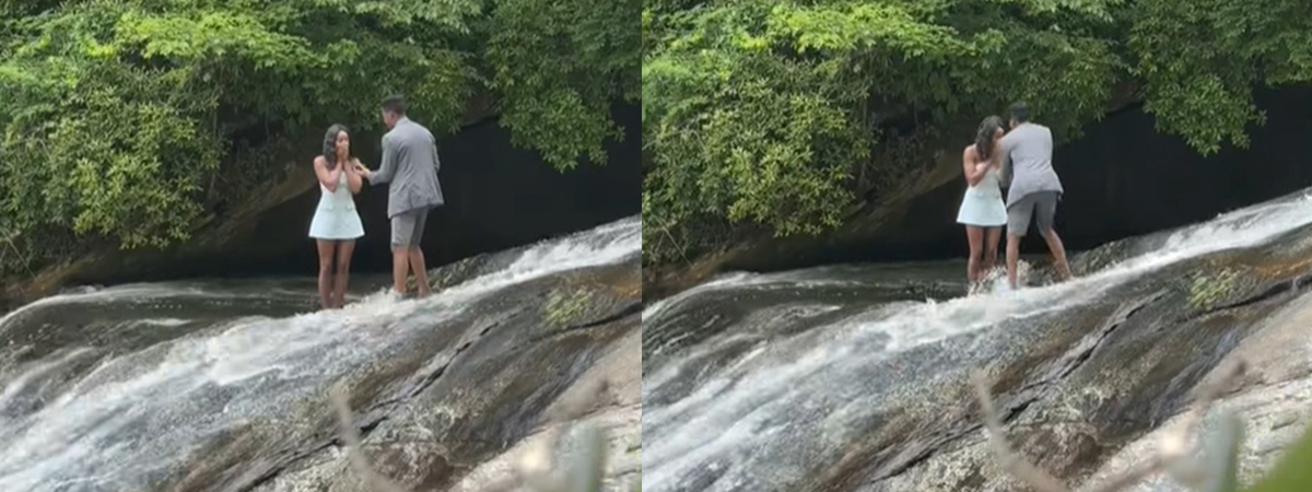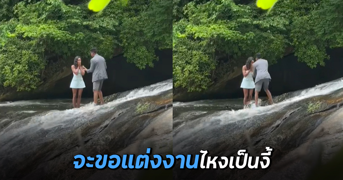 เกือบหล่อแล้วเชียว เจ้าบ่าวขอเจ้าสาวแต่งงานกลางน้ำตก ยังไม่ทันได้คุกเข่า หล่อลื่นซะแล้ว