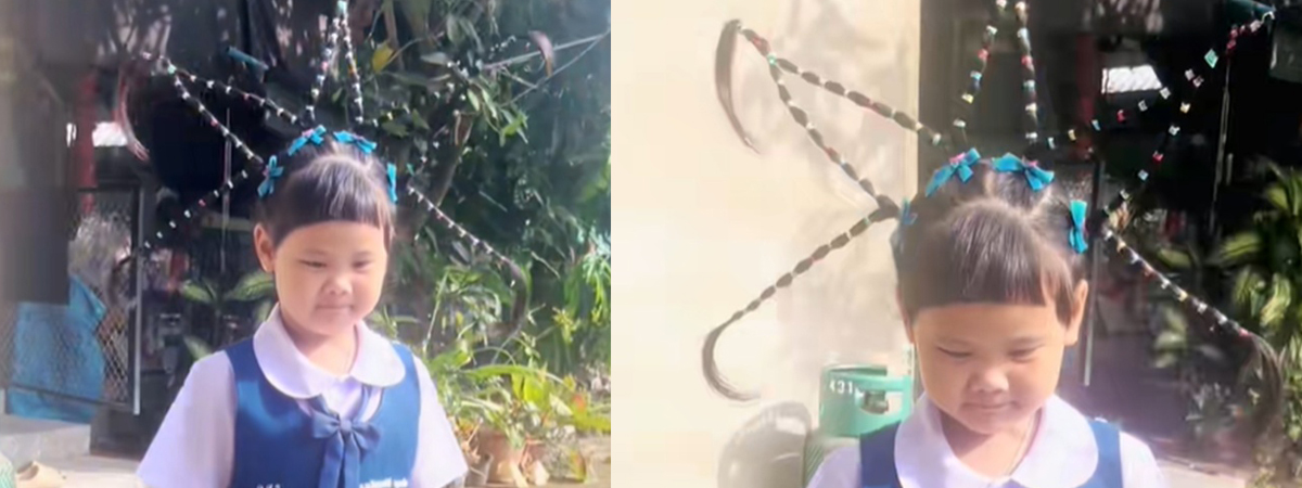 ผู้ใช้ TikTok @joopchaaaa ได้เผยภาพเด็กหญิงคนหนึ่ง ที่มาพร้อมกับทรงผมที่คุณแม่ทำให้ก่อนไปโรงเรียน มัดผมเป็นทรงน่ารัก จัดเต็มยิ่งกว่าใคร พอมาถึงขากลับ ตอนที่แม่ไปรับลูกสาว เห็นทรงผมเปลี่ยนไป ที่แท้เป็นฝีมือครูนั่นเอง สงสัยคงอยากจะประชันฝีมือกับคุณแม่สักแมตช์แน่ ๆ งานนี้