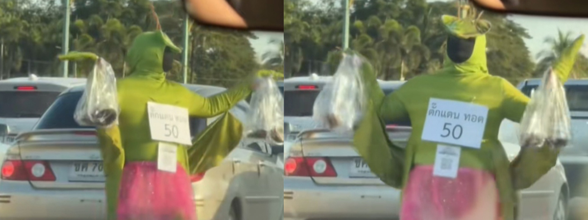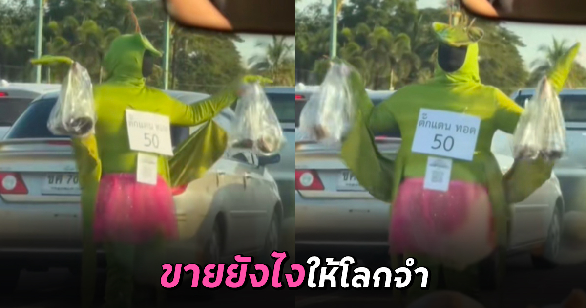 ผู้ใช้ TikTok @kaki_sirawit ได้เผยภาพคนขายตั๊กแตนทอด เดินถือถุงขายระหว่างรถติดไฟแดง แต่สิ่งที่ทำให้ผู้คนให้ความสนใจอย่างล้นหลาม คงจะเป็นตัวคนขายเองนี่แหละ ที่พยายามทุกวิถีทางเพื่อให้คนมาซื้อ เลยยอมลงทุนแต่งเป็นตั๊กแตน ขายแบบมิติใหม่ จนคนจำกันทั้งถนน