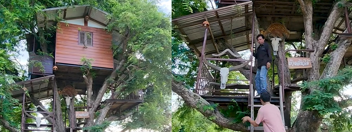 เฟซบุ๊ก Tagple ได้เผยภาพคุณลุงภารโรงท่านหนึ่ง พาเปิดบ้านที่สร้างอยู่บนต้นมะขาม โดยเริ่มสร้างในช่วงโควิดระบาด ยังไปทำงานที่โรงเรียนไม่ได้ เลยหาไม้เก่าเอามาสร้างเป็นบ้าน พร้อมหาเหล็กมาทำเป็นโครง ในงบประมาณเพียง 8,000 บาท ด้วยความที่ลุงเคยเป็นช่าง ผลลัพธ์ที่ได้คือ เป็นบ้านที่อยู่อาศัยได้จริง มีครบแทบทุกอย่าง แถมยังได้สัมผัสธรรมชาติอีกด้วย กลายเป็นแรงบันดาลใจในการสร้างบ้านให้กับชาวเน็ตหลาย ๆ คน