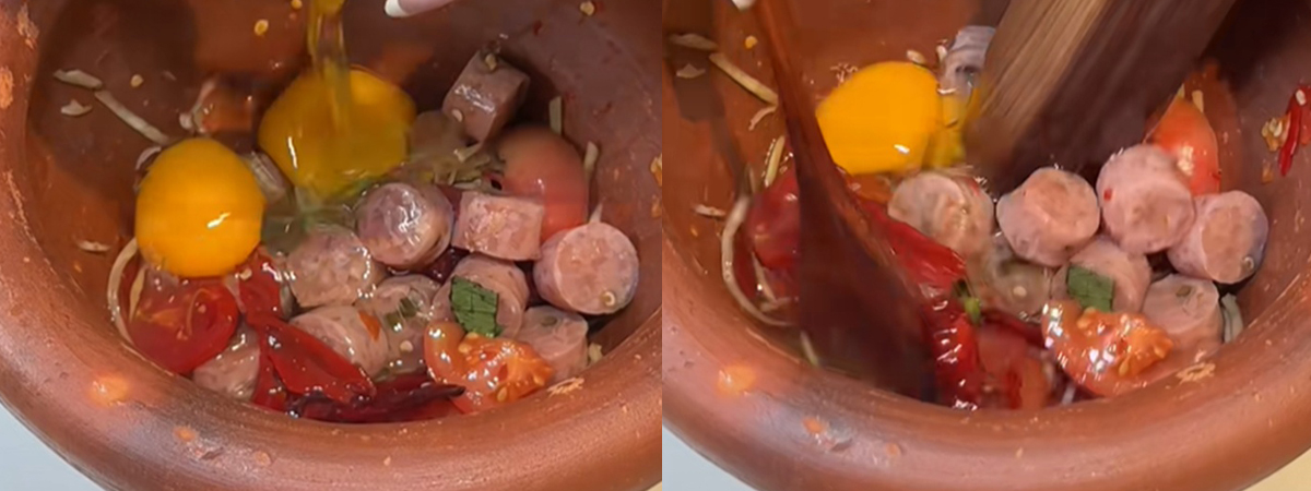 ผู้ใช้ TikTok @toktak.kat.review ได้เผยภาพสาวคนหนึ่ง ลองทำส้มตำใส่ไข่ทอด ที่กำลังเป็นไวรัลดังในโซเชียล ขั้นตอนในการทำเริ่มจากตำส้มตำไปแบบปกติ จากนั้นก็ตอกไข่ใส่ครก คนให้เข้ากันเล็กน้อย แล้วเทแป้งทอดตาม ต่อด้วยนำไปทอดลงกระทะ ก็จะได้เมนูส้มตำใส่ไข่ทอด หลังจากที่ชาวเน็ตเห็นผลลัพธ์ในการทำ ถึงกับขมวดคิ้วหนักกว่าเดิม