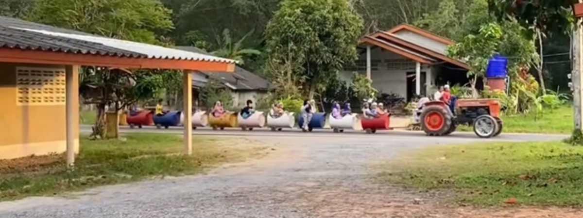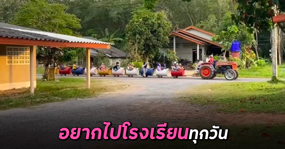 ผู้ใช้ TikTok @alee2537 ได้เผยภาพในหมู่บ้านจากตำบลลำไพล จังหวัดสงขลา กับการทำรถรับ-ส่งนักเรียนแบบใหม่ โดยเอารถไถนามาดัดแปลง พร้อมเอาที่นั่งเครื่องเล่นสวนสนุกมาเรียงต่อกันเป็นรถไฟ นอกจากความคิดสร้างสรรค์เลิศแล้ว ความน่ารักยังมาเต็ม จนทำให้เด็ก ๆ อยากไปโรงเรียนมากขึ้น