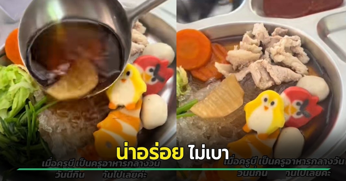 จากคลิปเป็นภาพคุ้นตาที่เด็ก ๆ ถือถาดหลุมมารับอาหาร แต่เมนูวันนี้มีวัตถุดิบเยอะมาก โดยครูนั้นเริ่มจากใส่วุ้นเส้น หยิบผักต่าง ๆ ก่อนจะหยิบปูอัด ลูกชิ้นหมู ลูกชิ้นแฟนซีรูปตัวการ์ตูน และเนื้อหมู ปิดท้ายด้วยการราดน้ำซุปดำ ออกมาเป็นเมนูชาบูที่ดูน่ากินไม่น้อยทีเดียว