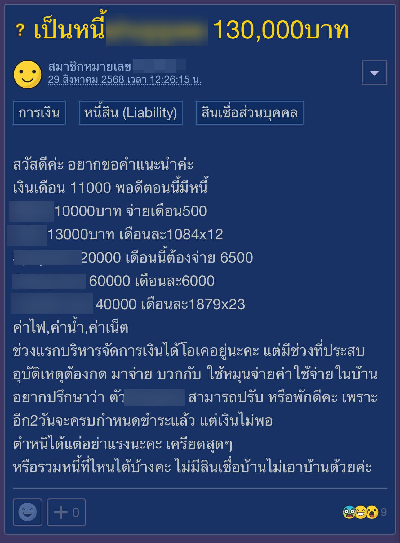 แต่ต้องรับผิดชอบหนี้สินหลายทาง ทั้งสินเชื่อส่วนบุคคล บริการซื้อก่อนจ่ายทีหลัง และค่าใช้จ่ายประจำบ้าน รวมเป็นเงินกว่า 130,000